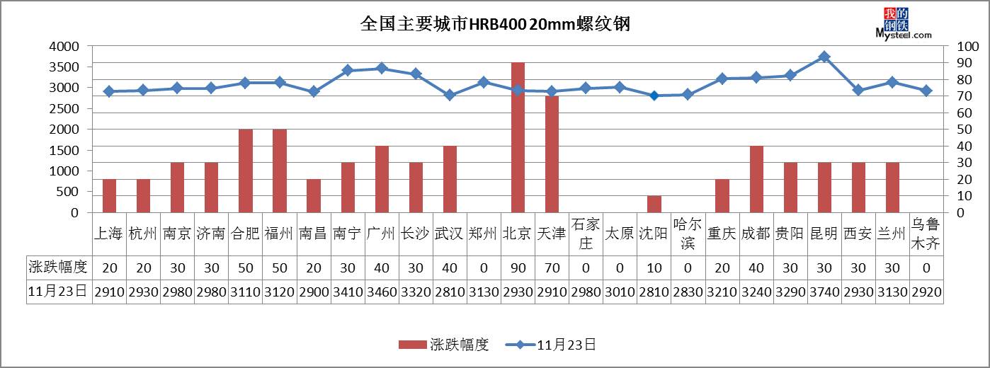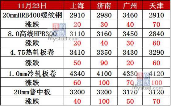 11月23日,全國鋼材市場價格繼續(xù)上漲。上海、濟(jì)南、北京、廣州、重慶等20個城市20mm螺紋鋼價格上漲20-90元/噸。4.75熱軋板卷市場價格繼續(xù)大漲。上海、濟(jì)南、廣州、武漢、京津冀、太原、沈陽、西安等21個城市價格上漲20—200元/噸;其中,太原市場大漲200元。國內(nèi)中厚板現(xiàn)貨價格延續(xù)漲勢,上海、廣州、武漢、京津冀、沈陽、西安等21個城市價格上漲10—110元/噸;其中,濟(jì)南、石家莊市場價格大漲百元。